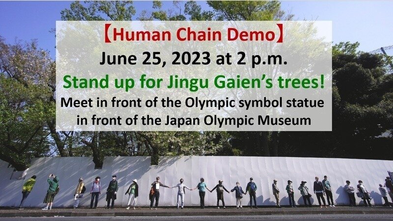 On Sunday the 25th, simultaneous to the human chain event, we will have a hashtag demonstration on Twitter. In the past we have been successful getting hashtags to trend, and this is effective in getting attention to causes. For those of you who are still using Twitter, please schedule a tweet with the hashtag #神宮外苑伐採始めないで (don't start chopping down the trees in Jingu Gaien) for 2 pm Sunday Japan time.
