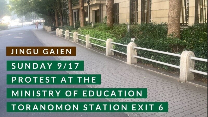 As an action to focus attention on the Ministry of Education, Culture, Sports, Science and Technology (MEXT)'s role in the Jingu Gaien redevelopment plan and demand revision of the plan, we will gather in front of the MEXT headquarters building on Sunday, September 17, at 1:00 p.m. to stand in the form of a human chain.