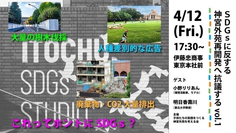 ITOCHU Corporation and Mitsui Fudosan, the developers of the Jingu Gaien redevelopment project, claim to uphold the UN's Sustainable Development Goals (SDGs). But a project that will chop down large number of trees and generate tremendous waste and CO2 emissions is hardly in line with the SDGs.