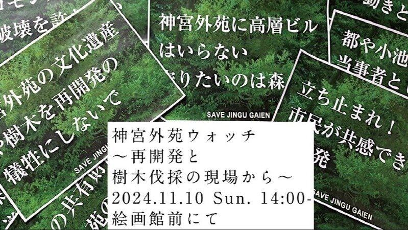 On November 10 (Sunday) in the afternoon, we will gather for a fieldwork session with many participants to observe the site of tree felling and transplantation related to the redevelopment. Let’s walk along the ginkgo tree-lined avenue with placards and banners and think together about what we can do moving forward.