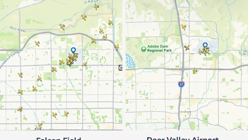 Supporters, what is happening over Falcon Field right now is completely out of control. Deer Valley is often called the busiest general aviation airport in the United States, yet the screenshot comparison speaks for itself: Deer Valley shows a handful of aircraft in the air, while Falcon Field is absolutely saturated, planes stacked in tight circles, swarming over neighborhoods in every direction, nonstop from morning until night. This is not normal airport activity. This is an unprecedented explosion of repetitive flight training traffic that has turned our community into a constant overhead racetrack, and families are being forced to live under it with no relief.