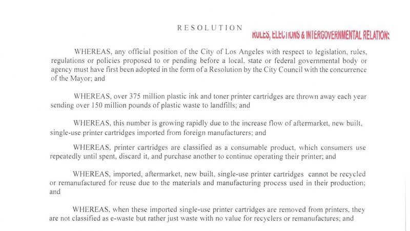 Petition updateSupport U.S. Remanufacturing! Help Stop the Importation of Single Use Printer CartridgesCity of Los Angeles Passes Resolution to Ban Single-use Printer Cartridges