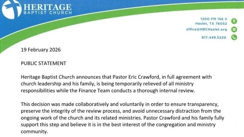 Heritage Baptist Church just released a statement that Pastor Crawford is "temporarily relieved" while an INTERNAL investigation is conducted. We've received many reports that this was well known within the church.