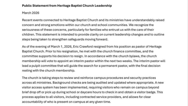 Because of the voices of so many parents, community members, and advocates, Eric Crawford has stepped down as pastor of Heritage Baptist Church announced as of March 2nd. You can see their post here.