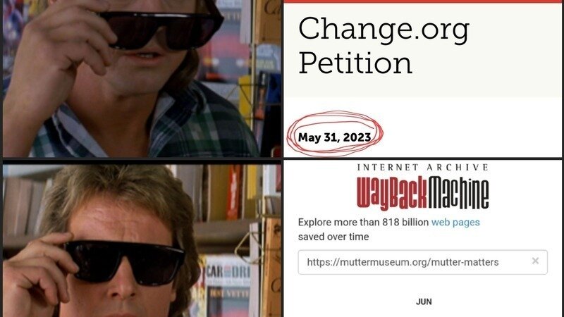Earlier this week we discovered today that there was a new page on the Mütter Museum website addressing the recent outcry. While the posts are dated in the past, thanks to the Wayback Machine we know the site only went live 6/27. They have backdated their responses to make it appear that they are replying in real time, when in fact the posts have only been live for a week! Despite the site being published on 6/27, there has been no communication about this page or the responses from the College. The administration has also returned a number of videos to the YouTube page. This was also done without any context or communication. Further examples of the lack of transparency and shady dealings from the administration.