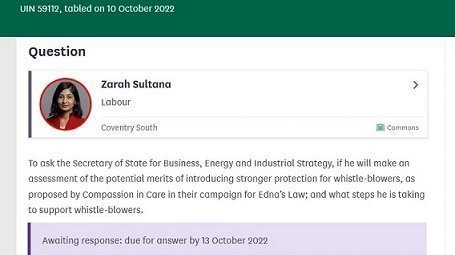 This Parliamentary question is significant because attempts had been made to silence the campaign for #EdnasLaw so we hope it will prompt awareness and investigation of what is really going on under the pretence of concern for whistleblowers.
