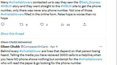 Actualización de la peticiónCall for Edna's Law and a public inquiry into whistle-blowingAnother false claim by WBUK: 3000 calls to a non-existent helpline