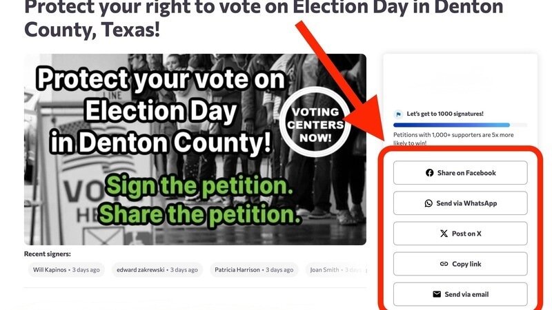 Petition updateProtect your right to vote on Election Day in Denton County, Texas!Share the Denton County Vote Centers petition NOW to help us hit the 1,000-signature milestone.