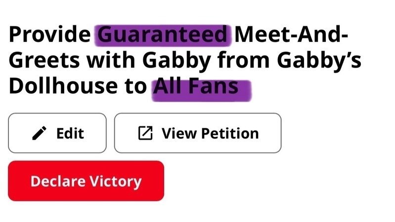 Petition updateProvide Guaranteed Meet-And-Greets with Gabby from Gabby’s Dollhouse to Fans All AgesI changed the title because……..