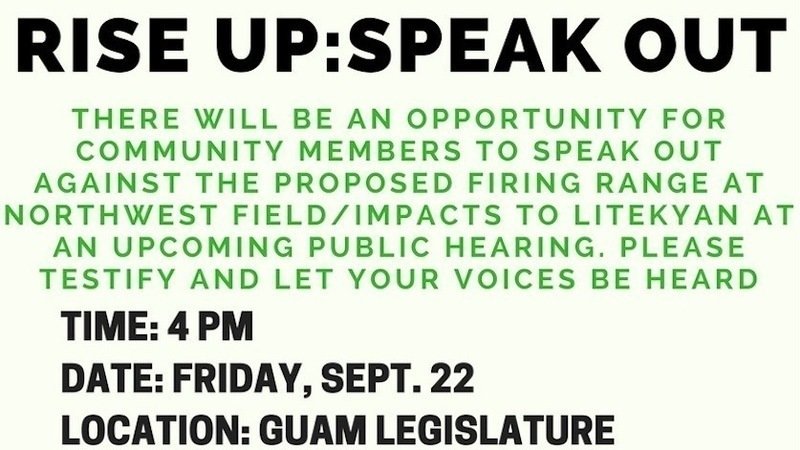 We need everyone out in full force this Friday, September 22 at 4pm at the Guam Legislature in support of Senator Nelson's resolution, which seeks to prohibit the construction of the Live-Fire Training Range Complex at Northwest Field.