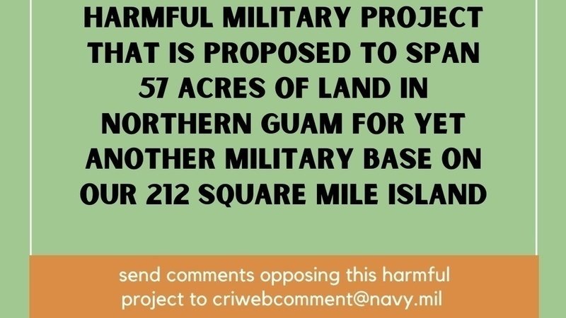 Residents have until July 15 to submit comments, ask questions or express concerns regarding a harmful military project that is proposed to span 57 acres of land in Northern Guam for yet another military base on our 212 square mile island.