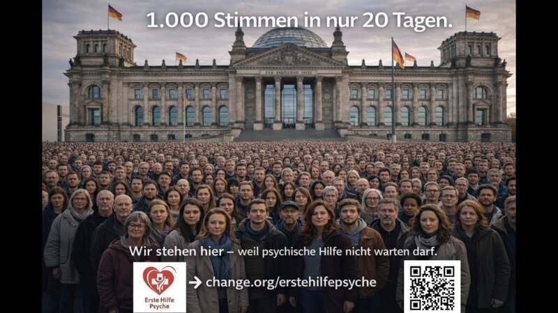 Mise à jour sur la pétitionPsychische Gesundheit: EHP - Erste Hilfe Psyche ins Regelsystem aufnehmen1.000 Stimmen in nur 20 Tagen – weil psychische Hilfe nicht warten darf.