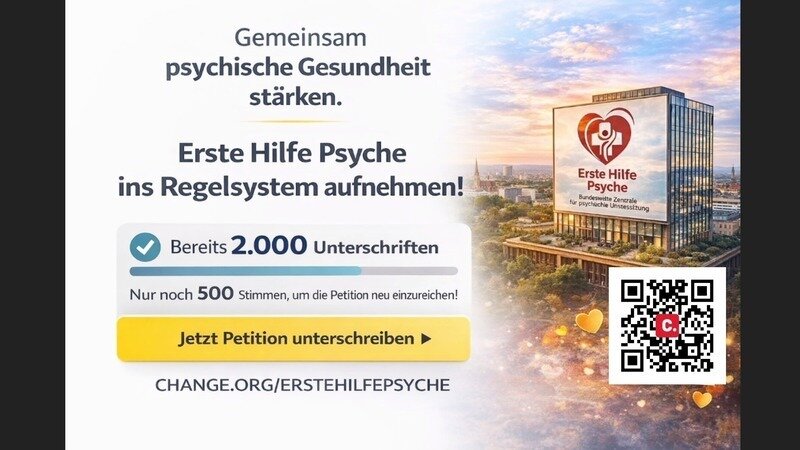 Petition updatePsychische Gesundheit: EHP - Erste Hilfe Psyche ins Regelsystem aufnehmen2.000 Stimmen für psychische Gesundheit – gemeinsam schaffen wir mehr 🤝