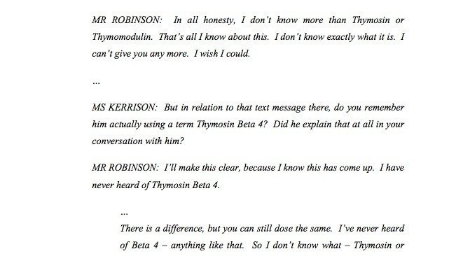 "MS KERRISON: But in relation to that text message there, do you remember him actually using a term Thymosin Beta 4? Did he explain that at all in your conversation with him?