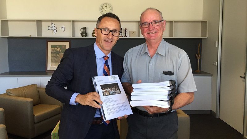 Mr Bob O'Dea, from J34, hands a copy of the Petition to Senator Richard Di Natale, Leader of the Australian Greens on 31 January 2017.