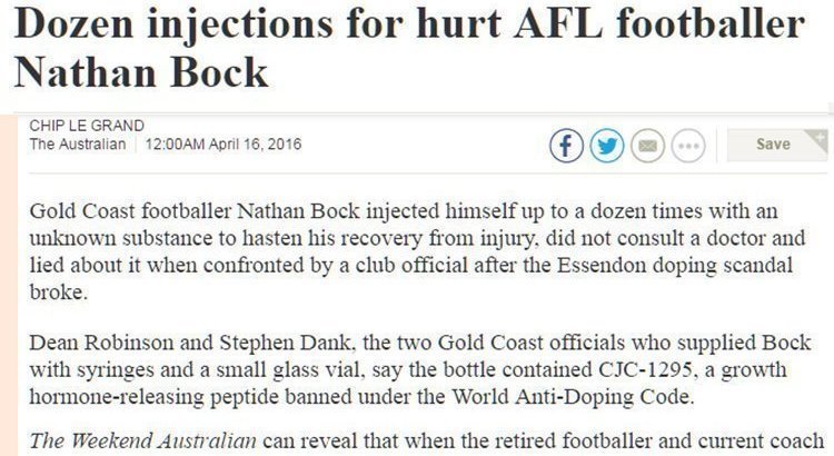 ASADA has been kind to Robinson, too. Dank was charged by ASADA and has been banned for life. But not so Robinson, despite his admitted involvement with banned substances while at the Gold Coast Suns. The Herald Sun this week said of Robinson: “(He) told ASADA investigators that (Gold Coast Sun Nathan) Bock visited his Gold Coast home where he gave him the banned substance CJC-1295 ... late in 2010.”