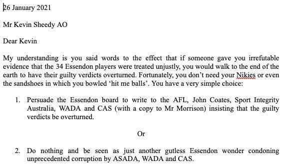 Mr Bruce Francis, an independent researcher into the Essendon 34 saga, has written to Kevin Sheedy A.O. to ask if he would look into evidence that 34 Essendon players were treated unjustly.