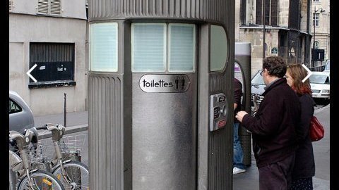 A Sanisette, a freestanding, coin-operated pay toilet stall in Paris.