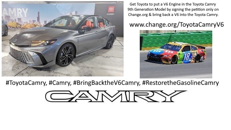 Welcome to my Toyota Camry V6 Petition. You're helping me, get Toyota to bring back the V6 Engine to the Toyota Camry & make it beyond a HEV Car & make it a Gasoline Model again.