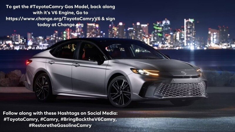 Follow along with Social Media Hashtags: #ToyotaCamry, #Camry, #BringBacktheV6Camry, #RestoretheGasolineCamry