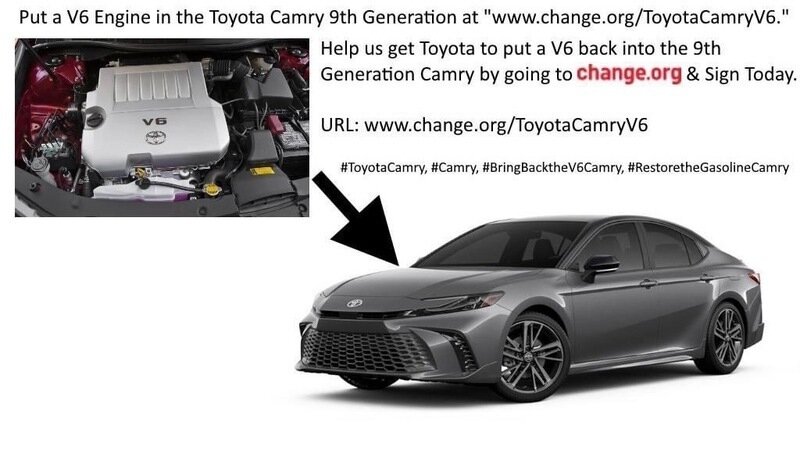 Follow along with Social Media Hashtags: #ToyotaCamry, #Camry, #BringBacktheV6Camry, #RestoretheGasolineCamry