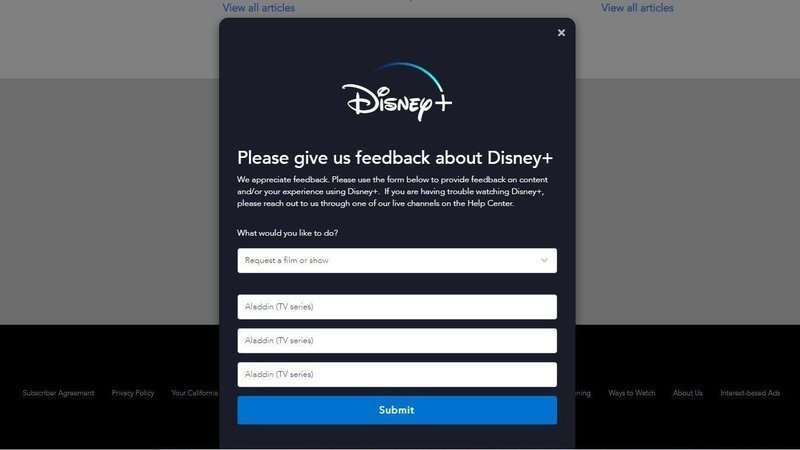 On the Disney+ website, there is a Feedback section where you can request a film or show. On there, we can type the same response in the three blanks and submit it. (If you want, you can repeat this multiple times.)