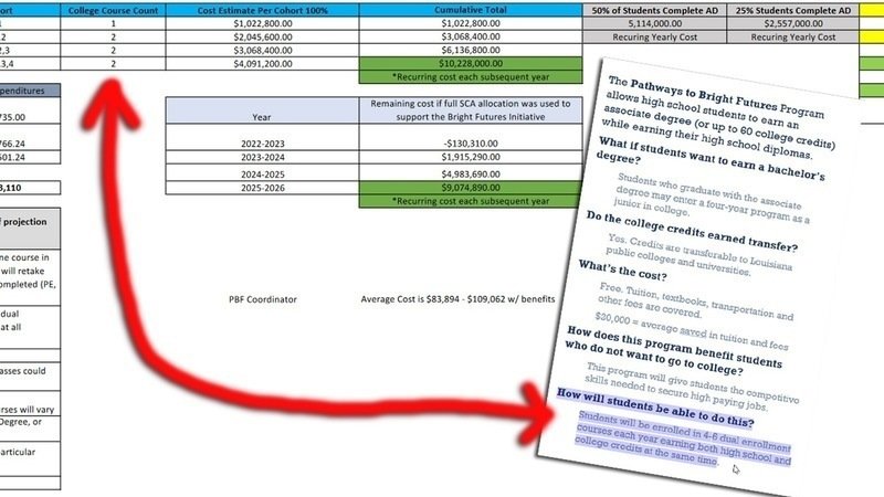 PBF does not simply include dual enrollment but also AP and College and Technical Educational Courses (CTEC). However, the biggest cost is with the dual enrollment section. The budget submitted to the Board states,"There are a plethora of variables in this type of projection . . . Below are some considerations." A student must complete 60 hours of DE credit to earn an associate's degree and get the advertised "Free. [sic] Tuition, textbooks, transportation and other fees are covered.. . . $20,000 = average saved in tuition and fees." That breaks down to $5,000 per year, per student unless there is some bulk purchasing option that has not been mentioned in the budget. Chief Financial Officer Kelly Lopez and PBF Manager Caron Smith have both stated that each DE course will cost about $400.00. The budget to be voted on and the updated brochure given to parents and linked below do not match up.