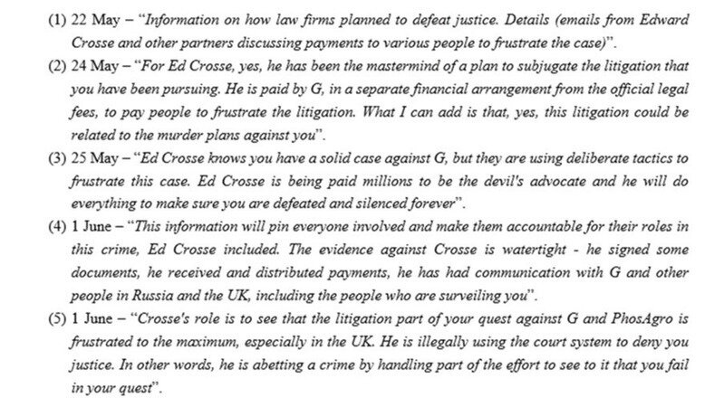 - 1 June - “Crosse's role is to see that the litigation part of your quest against G and PhosAgro is frustrated to the maximum, especially in the UK. He is illegally using the court system to deny you justice. In other words, he is abetting a crime by handling part of the effort to see to it that you fail in your quest”.