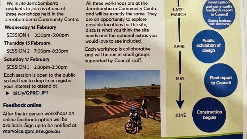 Petition updateQPRC Approval on the Pump Track location -Waterfall Drive - Jerrabomberra Creek ParkCommunity Consultation Workshops: 14-17 Feb 24 at Jerrabomberra Community Centre.