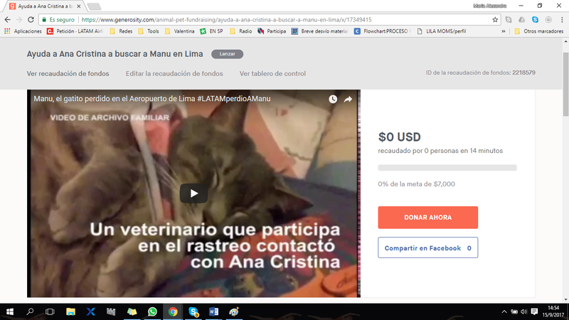 El lunes 11 de septiembre LATAM Airlines me envió pasajes aéreos para ir a Lima, no para integrarme al equipo de búsqueda sino para identificar a un presunto gatito, encontrado en la zona de carga. Viajé el martes 12 a primera hora. Junto a una veterinaria hicimos un examen de exploración, y cinco características determinantes me permitieron saber que el gatito encontrado no es Manu.