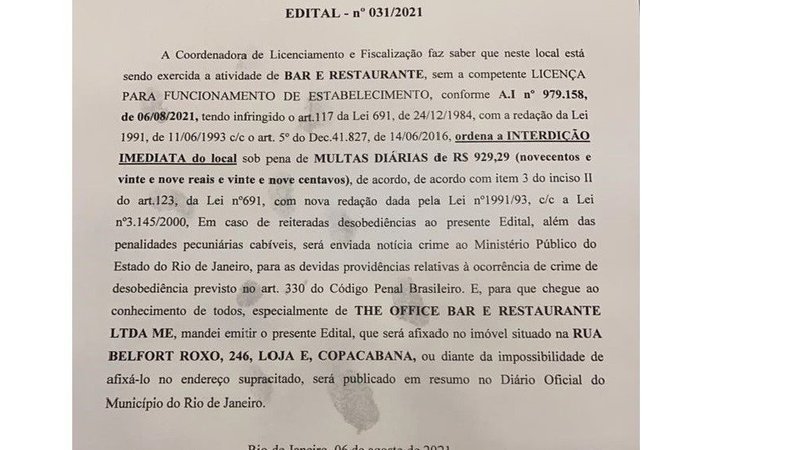 O The Office Bar continua desafiando as autoridades e a paciência dos moradores da vizinhança, na Rua Belfort Roxo, em Copacabana. O bar teve o alvará de funcionamento cassado pela Secretaria de Ordem Pública (DOMRJ, 19/07/2021, pág. 42) e uma ordem de interdição imediata assinada pela coordenadora de Licenciamento e Fiscalização (em 06/08/2021), mas continua abrindo diariamente, como se nada tivesse acontecido.