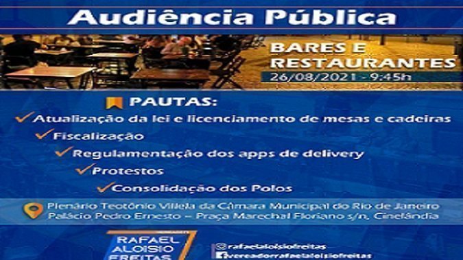 A Comissão Especial da Câmara Municipal do Rio que discute a situação econômica, financeira e jurídica dos bares e restaurantes na cidade vai realizar uma audiência pública nesta quinta-feira (26), às 10h. A reunião acontece de forma híbrida, no Plenário da Casa. O presidente da Comissão, vereador Rafael Aloisio Freitas (Cidadania) vai intermediar a interlocução entre os proprietários de bares e restaurantes e os agentes municipais, visando encontrar alternativas para a crise enfrentada pelo setor durante a pandemia.