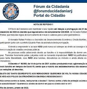 NOTA DE REPÚDIO!!!O Fórum da Cidadania vem manifestar o seu repúdio em relação a prorrogação até 31 de dezembro de 2022 do decreto que regulamenta a lei complementar 226/2020, do Vereador Rafael Freitas, que trata das regras de licenciamento de mesas e cadeiras para o setor gastronômico. O Vereador Rafael Freitas e o Secretário de Desenvolvimento Econômico, Chicão Bulhões, participaram junto com o prefeito Eduardo Paes da assinatura desta prorrogação.