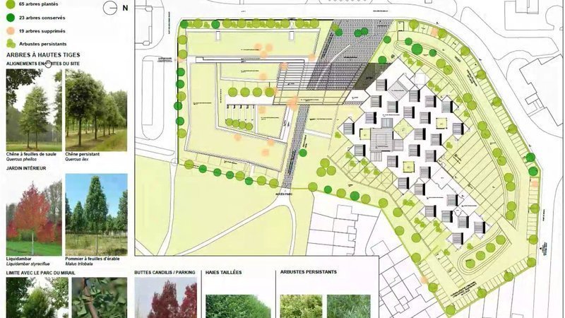 « Une plantation d’arbres à hautes tiges à feuillage caduc (chêne à feuille de saule) et d’arbres à feuillage persistant (chênes verts) sont plantés le long des parkings rue Maillol. Une haie de troène, arbustes à feuillage persistant borde la grille.