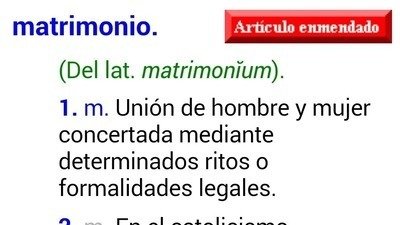 Dado que se encuentra legalizado el matrimonio homosexual, se debería cambiar la definición dada de "unión entre un hombre y una mujer" y "marido y mujer", por una que se adecue a la legislación vigente.