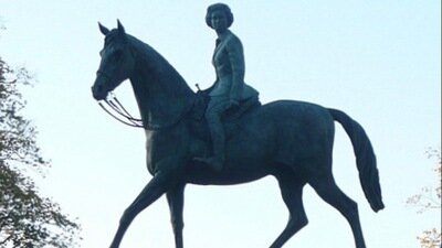 Raise an equestrian statue of her late Majesty Queen Elizabeth in St James’ Park, as we knew her, on horseback at the Trooping of the Colour, instead of a standing robed figure on an elevated bollard.