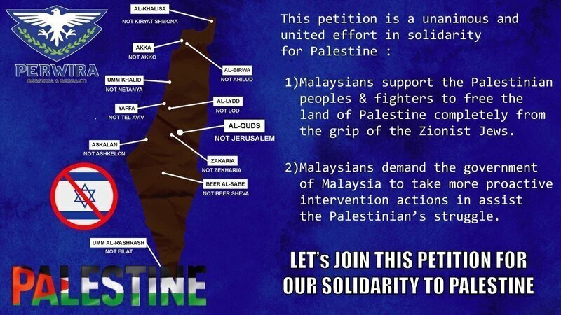 - Kami menyeru kepada masyarakat Malaysia untuk bersama-sama memainkan peranan mengajak ahli keluarga, rakan-rakan dan jiran tetangga untuk bersama menyokong petisyen ini dan menyebarluaskan kesedaran berkenaan isu terkini Palestin yang sedang memasuki fasa baharu gerak kerja perjuangan rakyat dan pejuang Palestin dalam membebaskan bumi Palestin ini.