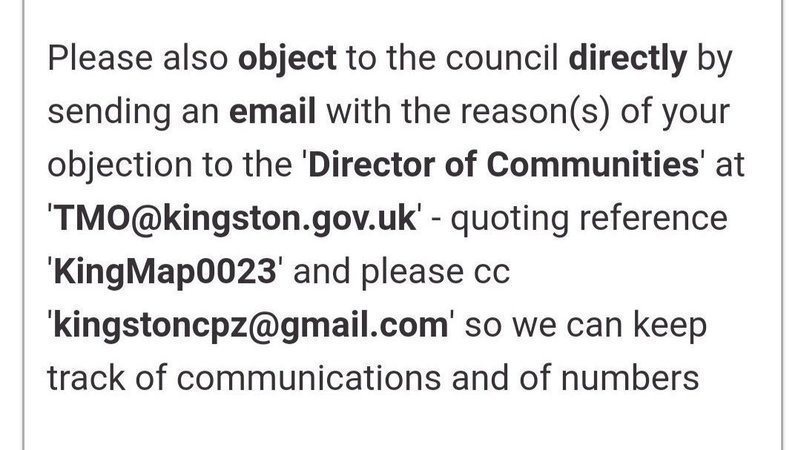 In addition to the petition and to put more pressure on the council please also object to the council directly by sending an email with the reason(s) of your objection to the 'Director of Communities' at 'TMO@kingston.gov.uk' - quoting reference 'KingMap0023' and please cc 'kingstoncpz@gmail.com' so we can keep track of communications and of numbers.
