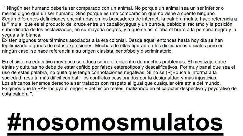 Exigimos que la RAE ( REAL ACADEMIA ESPAÑOLA ) defina claramente el origen despectivo de las palabras. En lo que se refiere a la palabra mulato/a como uso en la sociedad española. Muchas personas no saben que esta palabra tiene connotaciones negativas hacia los afrodescendientes descendiencia de familias mixtas.
