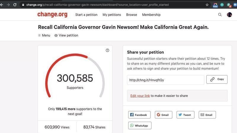 Petition updateRecall California Governor Gavin Newsom! Make California Great Again.300k Strong! What is next?