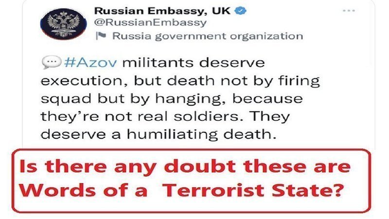 Just after the illegal shelling of the POW camp in Olenivka by Russia, to destroy the evidence of torturing and killing Ukrainian POWs the following tweet appeared on the Russian Embassy UK's Twitter Account.