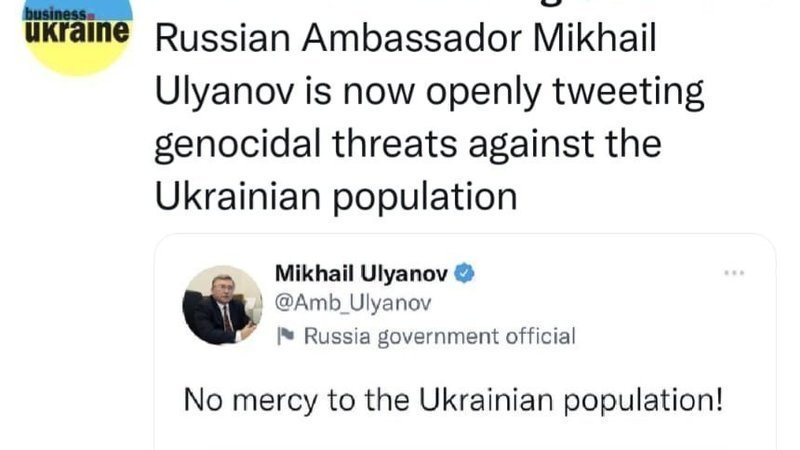 Mikhail Ulyanov, russian Permanent Representative of russia to International Organizations in Vienna announces the genocide of Ukrainians with the words "No mercy to the Ukrainian population!"