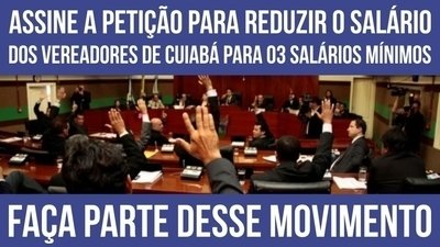 Projeto de Lei de Iniciativa Popular para reduzir o Salário dos Vereadores de Cuiabá, que hoje recebem o valor de R$ 15.900,00, mais R$ 18.900,00 de verba indenizatória, totalizando R$ 34.800,00 mensais, para cada um dos 25 Vereadores de Cuiabá.