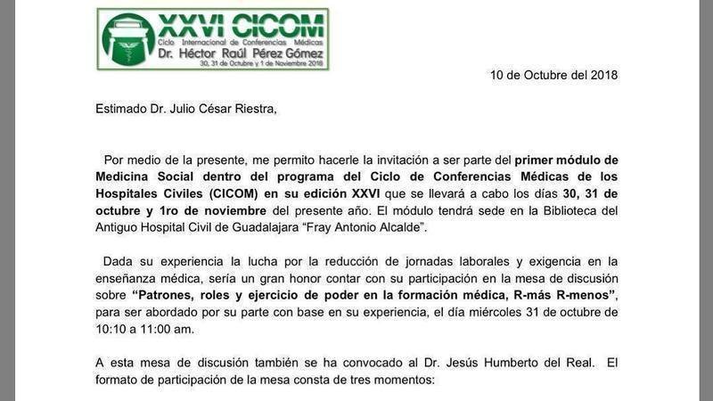 Les anexo una invitación que me hicieron al Congreso CICOM de los Hospitales Civiles de Guadalajara para abordar parte del tema de nuestra petición. Seguiremos impulsando al movimiento y presionando a las autoridades federales y locales a modificar su esquema de guardias.