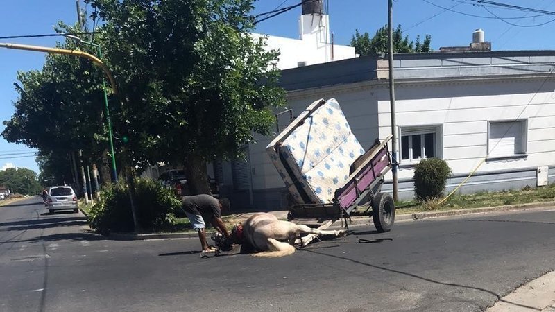 LA PLATA , en la calle 13 y 74 cayó desplomado un caballo que iba arrastrando un carro, tras ser herido por un fierro que le causo un sangrado de consideración mientras circulaba .