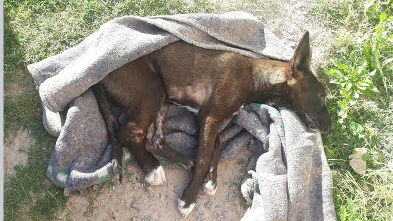 El perrito que debió ser trasladado a una veterinaria donde falleció , presentando ademas de los hematomas, deshidratación, sarna, parvovirus,