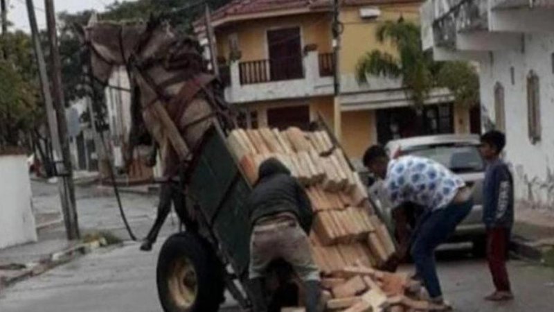 La escena fue registrada en la esquina de las calles Islas Malvinas y Belgrano de la ciudad termal, donde dos sujetos ALBAÑILES,intentaban usar el precario vehículo para transportar ladrillos.
