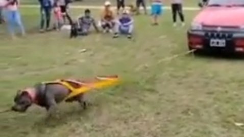 El dueño del animal puso a su perro a tirar de un auto, mientras le acercaban un cebo a la boca para que hiciera más fuerza y moviera el vehículo.