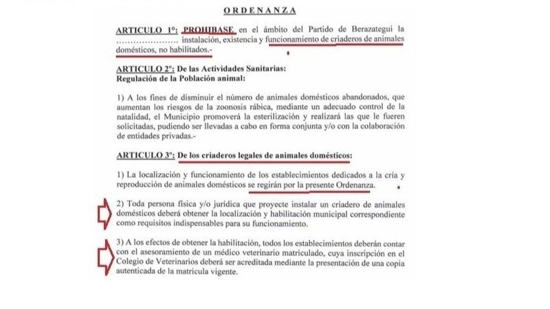 El articulo 1º, dejaba en claro que solo prohíben los criaderos que no están habilitados y que a partir de ahora para quienes deseen instalar criaderos deben seguir los requisitos dispuestos por la municipalidad para su habilitación.