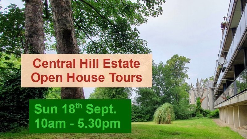 On Sunday, 18th September, the planned Central Hill Estate Open House tours at 10am and 3pm and the talk at 1pm will go ahead. All are welcome to join us, starting from, or being held in the basketball court.